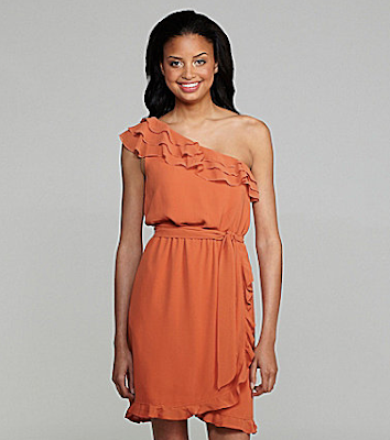 I went shopping with my cousin on Sunday to find my bridesmaid's dress for her wedding. Her only requirement was that it be orange-ish and coordinate with the other bridesmaid dresses. This was easier said than done, but after looking at at least five stores and trying on lots of dresses, we were able to find a dress for both me and for Johanna's other cousin Hannah. My dress is made by Jessica Simpson and was actually 65 percent off. Yippee! I think that I'm going to replace the sash with a leather belt to better match my cowboy boots.